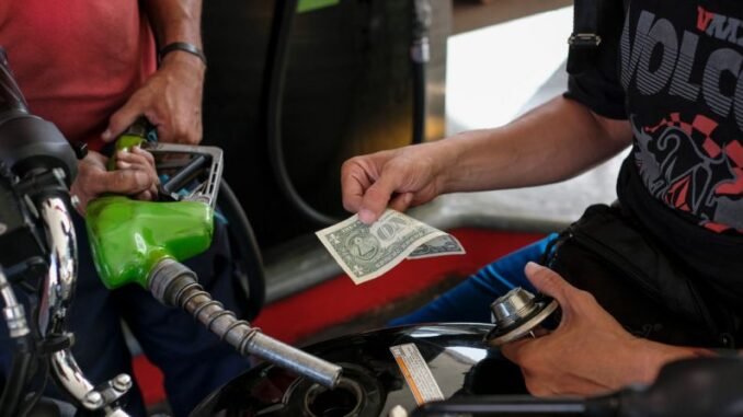 Un hombre paga con un billete de un dólar americano después de llenar el depósito de su moto en una gasolinera el 26 de junio de 2019 en Caracas, Venezuela. (Foto de Matias Delacroix/Getty Images)