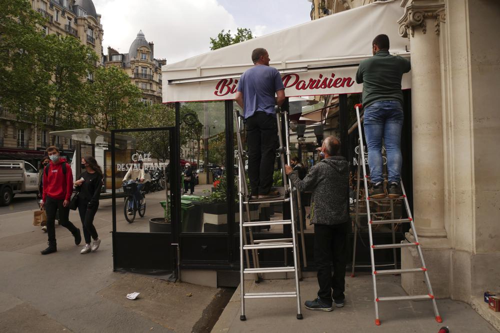 Operarios reparan el toldo de la terraza de un restaurante, antes de su reapertura, en París, el 18 de mayo de 2021. (AP Foto/Thibault Camus)
