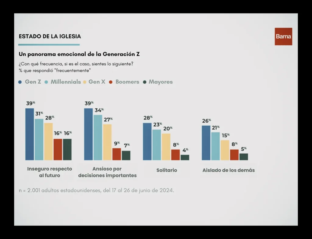 A pesar de esta dicotomía, en los resultados obtenidos por Barna se evidencian dos tendencias interesantes. La primera es que, si bien el enfoque de la investigación está en las altas cifras reportadas por la generación Z, los números de los millennials son notoriamente cercanos. La segunda es que claramente hay un aumento progresivo de los sentimientos mencionados entre una generación y otra (lo cual analizaremos con más detalle en un momento).