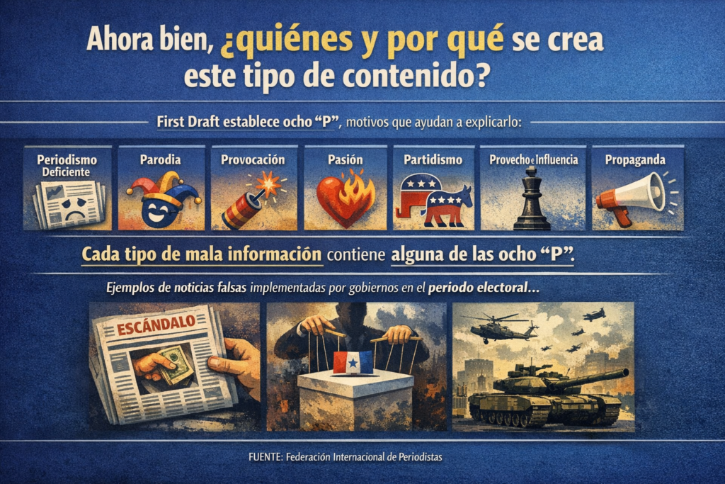 La desinformación no es un fenómeno homogéneo, sino un ecosistema complejo. La organización First Draft identifica distintos tipos de contenido erróneo, desde la sátira sin intención de daño hasta el contenido fabricado diseñado para engañar, pasando por formas más sutiles como el contexto falso o la manipulación de información real. Sin embargo, más allá de sus formas, lo relevante es entender sus motivaciones: las llamadas ocho “P”, que van desde el periodismo deficiente y la provocación hasta el provecho económico, el partidismo o la propaganda. En este sentido, cada pieza de desinformación no solo responde a un formato, sino a un interés concreto que explica su origen y su impacto.