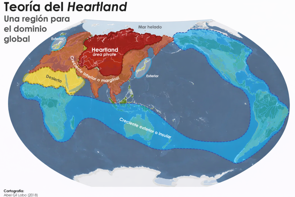 Una de las teorías más influyentes es la del heartland, formulada por Halford Mackinder. Esta divide el mundo en distintas regiones estratégicas y plantea que quien controle Asia Central —el área pivote— tendrá la capacidad de dominar Eurasia y, en última instancia, el mundo.